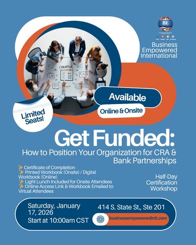 Unlock the funding your organization has been missing. This transformational workshop equips nonprofits, ministries, community programs, and business leaders to confidently approach banks, speak the language of CRA, and build long-term funding partnerships.