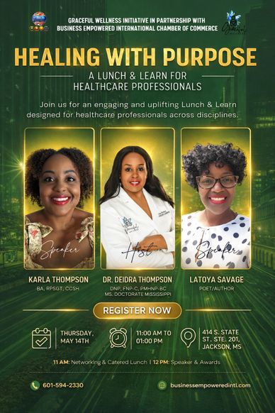 Join us for Healing with Purpose: A Lunch & Learn for Healthcare Professionals, an uplifting experience focused on whole-person wellness, mental health, and professional growth. This event brings together healthcare leaders for networking, a powerful keynote, and recognition of excellence—all while providing practical tools for resilience, balance, and impact.