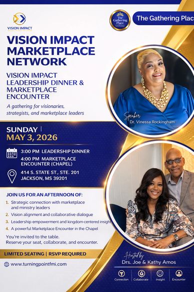Join us for an intentional gathering of visionaries, strategists, marketplace leaders, and ministry leaders as we come together for meaningful connection, collaborative dialogue, leadership empowerment, and Kingdom-centered insight. This experience is designed to create space for relationship building, vision alignment, and a powerful Marketplace Encounter where we are believing for miracles, signs, and wonders that will encourage, strengthen, and empower leaders for greater impact in their sphere of influence.