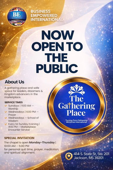 The Gathering Place is a welcoming space for leaders, dreamers, and Kingdom-minded individuals seeking alignment, growth, and renewal in the marketplace and beyond. We offer worship, prayer, teaching, and marketplace-focused encounters designed to equip individuals to live with purpose, clarity, and impact. The chapel is also open during the week for personal reflection, prayer, and spiritual alignment in a peaceful and safe environment.
