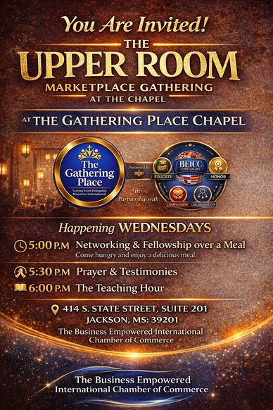 The Upper Room Marketplace Gathering is a midweek experience designed for workplace professionals, business owners, entrepreneurs, ministry leaders, and community builders seeking prayer, connection, and spiritual renewal in the flow of the workweek. Hosted at The Gathering Place Chapel, this gathering creates space for networking, testimonies, prayer, and teaching that equips leaders to live out purpose and faith in the marketplace.