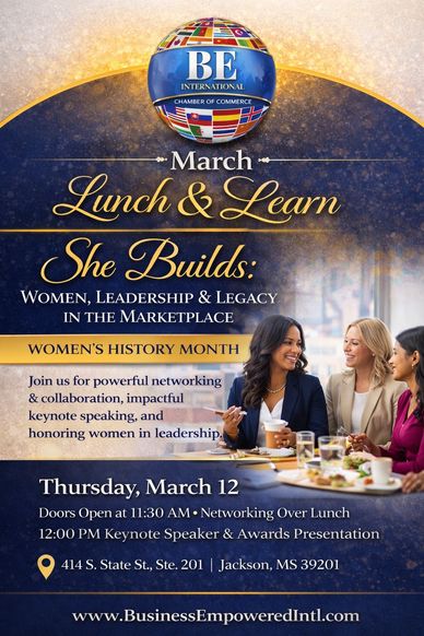 Join us for our March Lunch & Learn, She Builds: Women, Leadership & Legacy in the Marketplace, a special Women’s History Month gathering hosted by the Business Empowered International Chamber of Commerce. This powerful event will feature intentional networking over lunch, an impactful keynote message, and the honoring of women who are leading with vision, integrity, and lasting influence. Come connect, collaborate, and be inspired alongside dynamic women who are shaping the marketplace and building a generational legacy.