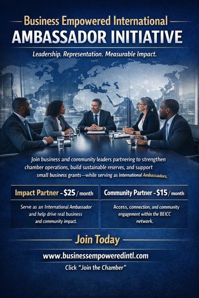 The Business Empowered International Ambassador Initiative connects business and community leaders to the resources, relationships, and opportunities of Business Empowered International Chamber of Commerce—regardless of location. Through chamber membership, leadership development, and strategic representation, partners gain access to professional growth, meaningful connections, and the opportunity to support small business and community impact on a local, national, and global scale.