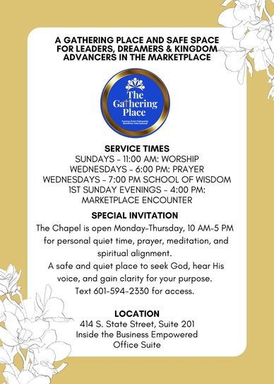 “The Gathering Place Chapel—now open downtown at 414 S. State Street, Suite 201—offers quiet space for prayer and reflection for business and community leaders. Sundays at 11, Monday through Thursday 10 to 5. Text 601-594-2330 to reserve private time.”