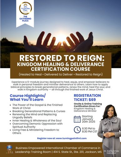 Join Dr. Kathy L. Amos for the Restored to Reign: Kingdom Healing & Deliverance Certification Course — a six-module journey designed to heal, equip, and empower believers to live free and minister freedom to others.